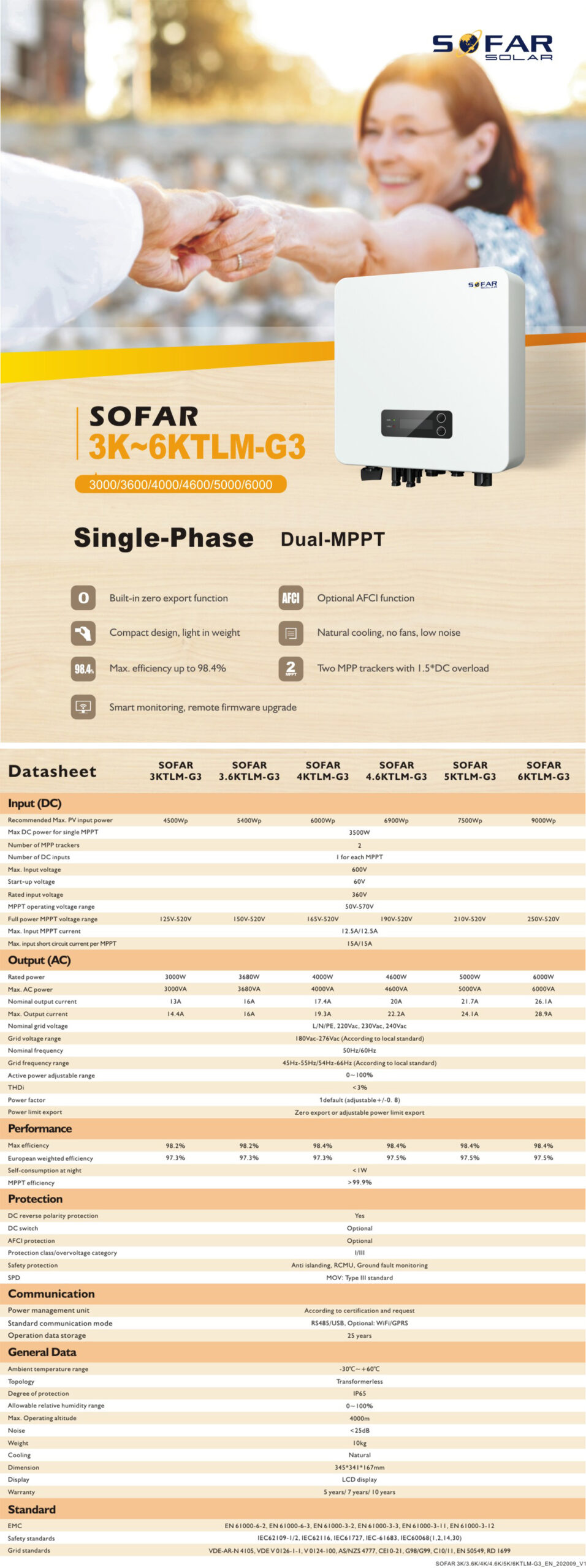 SOFARSOLAR, certified by ISO9001&ISO 14001, with around 600 employees, is equipped with a very strong R&D team and the major R&D personnel have more than 10 years’ experience in the PV industry.SOFARSOLAR has successfully improved many area of technology in both software and hardware which had not been solved by other popular brands in the recent past.For example, detection accuracy of insulation resistance, grid resonance if multiple units are connected, remote monitoring-Wifi as standard communication, anti-corrosion protection, etc.
